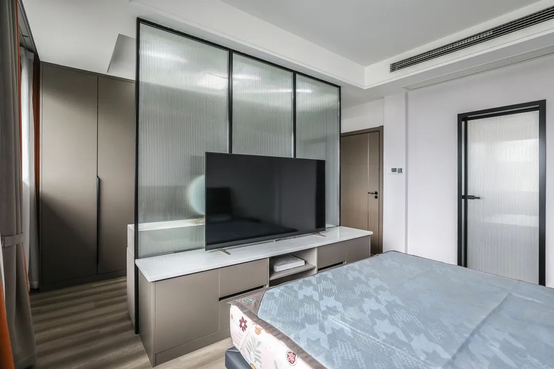 主衛(wèi)空間也很大,只放一個(gè)馬桶,一個(gè)洗手臺(tái),做一排儲(chǔ)物柜,增加主人的收納空間,黑色邊框長(zhǎng)虹玻璃門(mén),讓整個(gè)空間協(xié)調(diào)統(tǒng)一,大氣時(shí)尚,主人很滿意,不斷地夸贊對(duì)色彩的精準(zhǔn)把握。