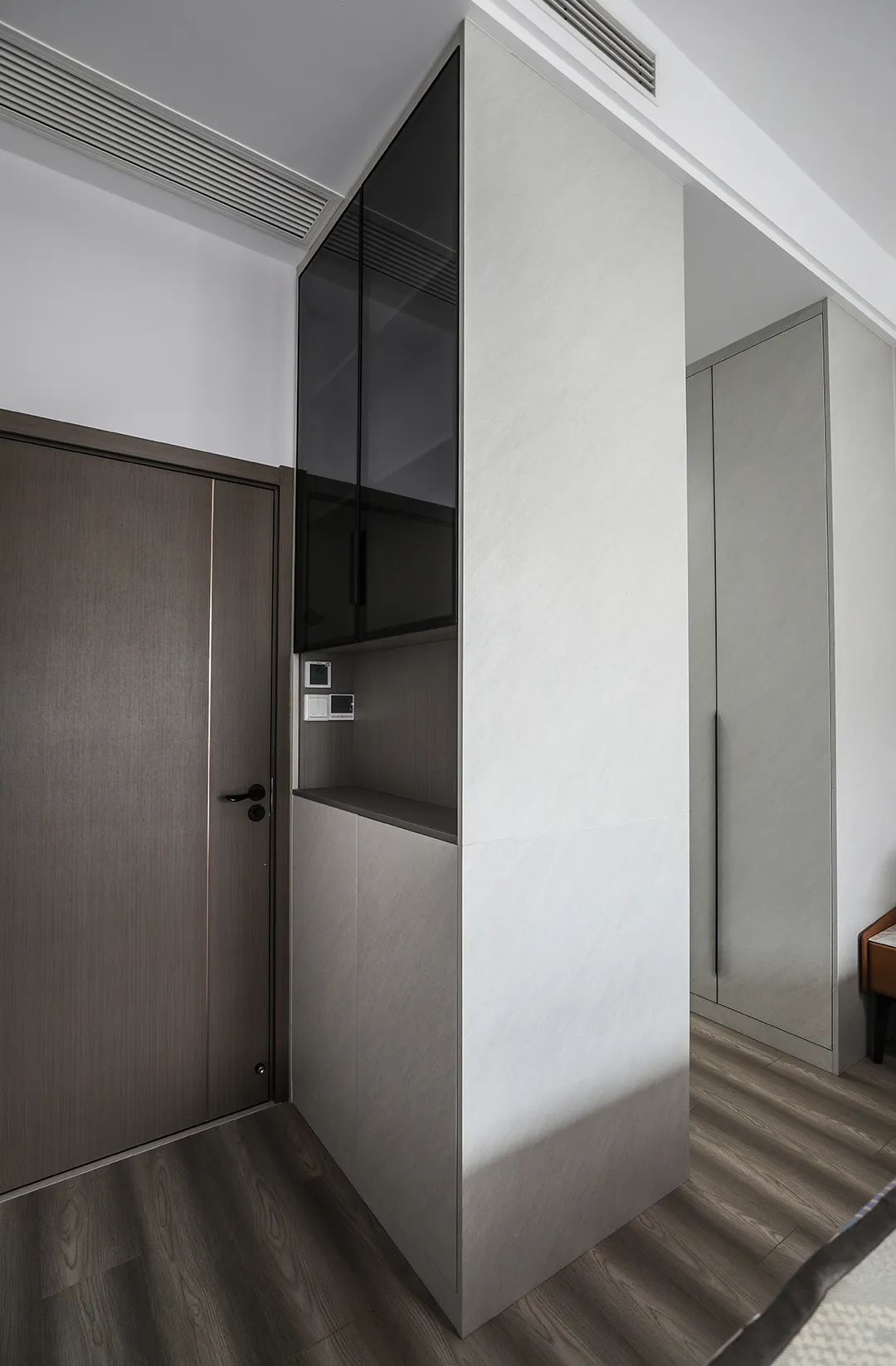 進(jìn)門(mén)玄關(guān)采用中間鏤空通頂柜設(shè)計(jì),體現(xiàn)生活“一半煙火,一半清歡”的理念??白色柜子是鞋柜,整面鞋柜滿足一家人鞋子的收納。黑色柜子是儲(chǔ)物柜,放一些比較雜的物品(快遞盒、各種囤貨、雨傘等),鞋柜和儲(chǔ)物柜都做了扣手槽設(shè)計(jì)讓生活更輕松。