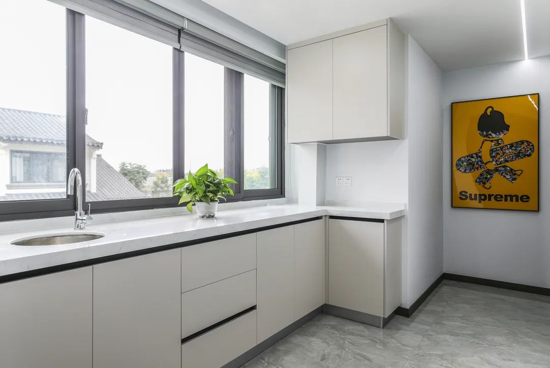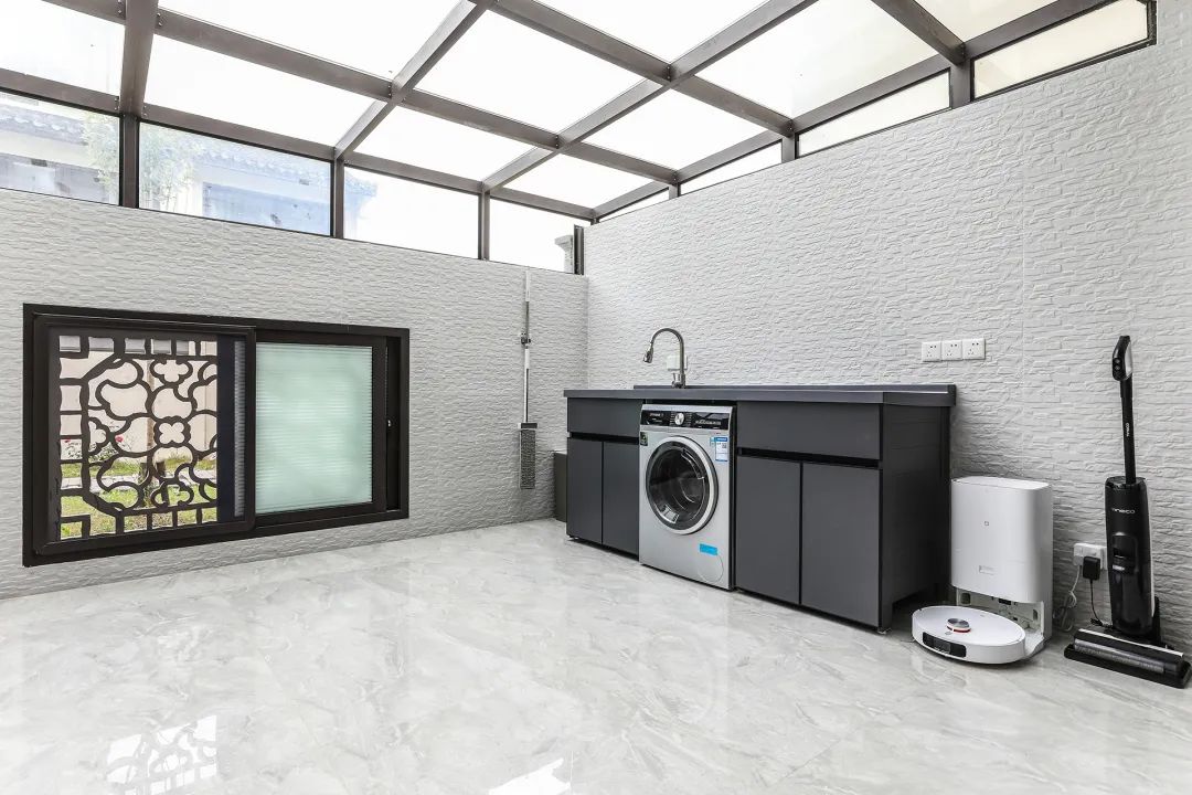 北露臺(tái)是晾曬衣物的場(chǎng)所,一側(cè)洗衣機(jī)和水池,一側(cè)為儲(chǔ)物柜,超大玻璃天窗讓陽(yáng)光柔和的照進(jìn)來(lái),很舒適、很愜意。極具“白墻黛瓦馬頭墻,回廊掛落花隔窗。”的徽派建筑甄格。