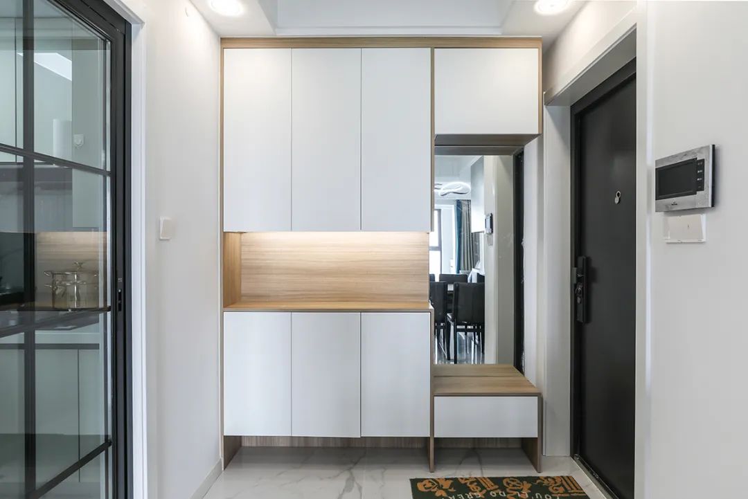 在簡約風玄關設計中,色彩一般以白色或灰色為主,以突出玄關的簡約和高級感。同時,材質的選用也非常重要,常見的是木紋飾面板、金屬板、玻璃等材質,這些材質的選用可以增加玄關的質感和現代感。