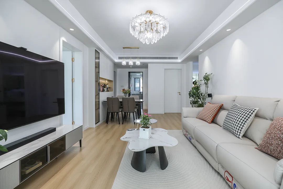 65寸大屏電視,沙發旁邊的裝飾盆景作襯托,巖板臺面電視柜也很大氣,讓空間不但時尚而且清爽。沙發背景刷米白色涂料,米色的沙簾,沙發背景留白設計,色調上墻面涂料和窗簾用淺色,沙發用淺灰色,深淺搭配的錯落有致,既溫馨又簡潔。