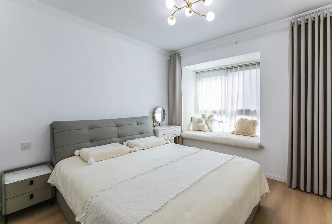 主臥原木地板,所以床選擇的是淺色,衣柜門板也是淺色,這樣整體搭配,就不會那么突兀,臥室帶個大飄窗,體現了簡約風格的簡潔、隨意,不拘一格。