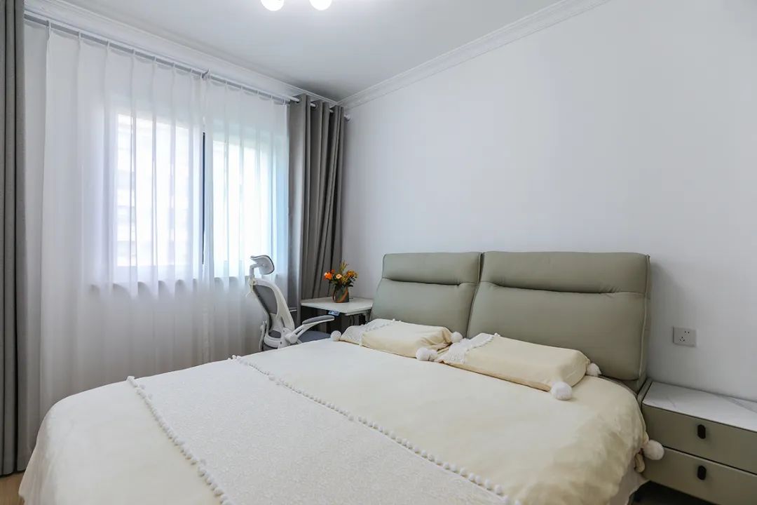 次臥與主臥整體風格極其統一,除了沒有小陽臺外、化妝臺外,我們相當于把主臥COPY過來,這樣整個房子的設計極具靚麗秩序感。