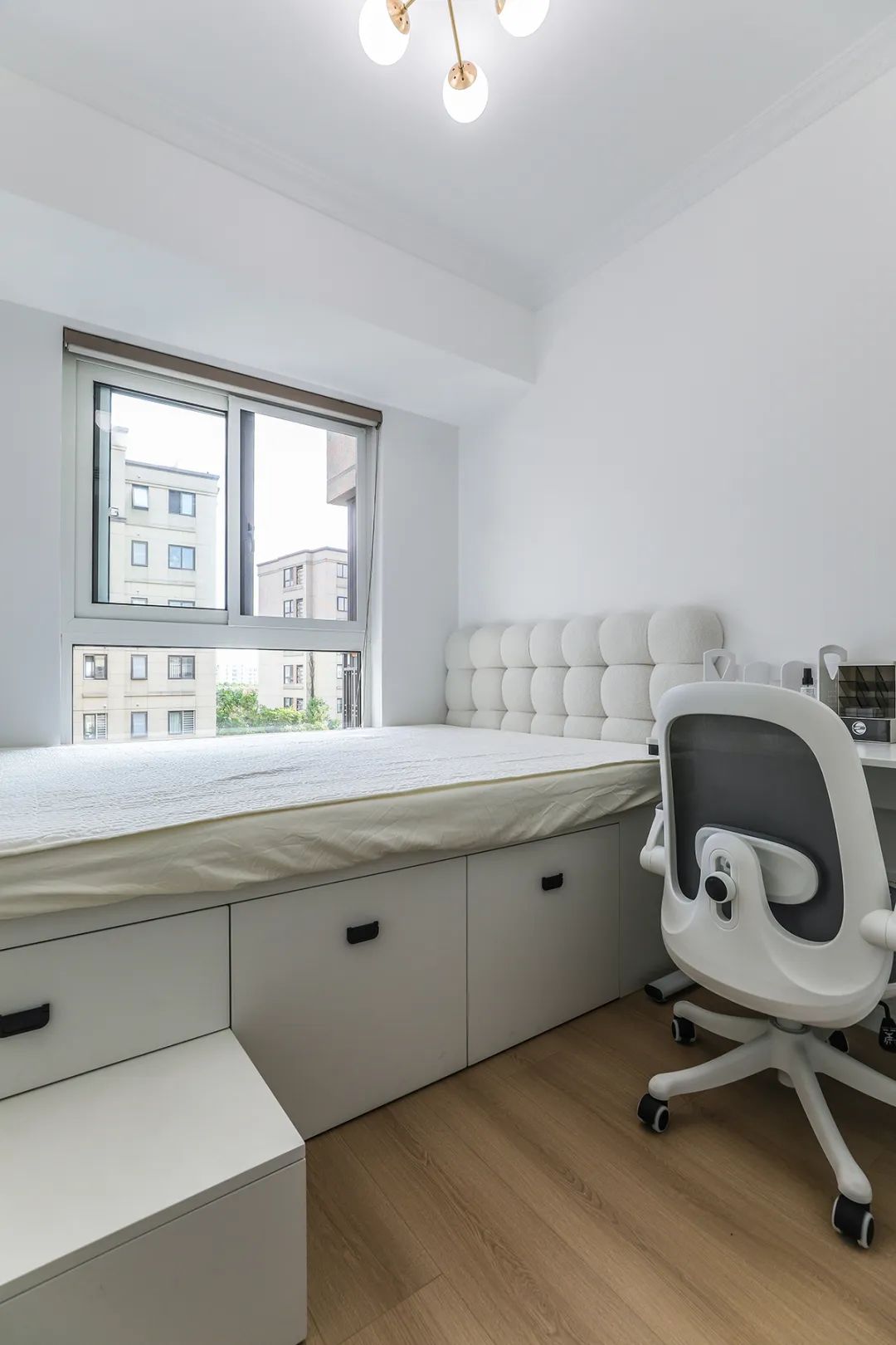 兒童房間較小,我們將床靠窗設計,這樣將多出來的空間做閱讀桌和收納柜,可以空間最大化利用,保障兒童房雖小,但功能俱全。