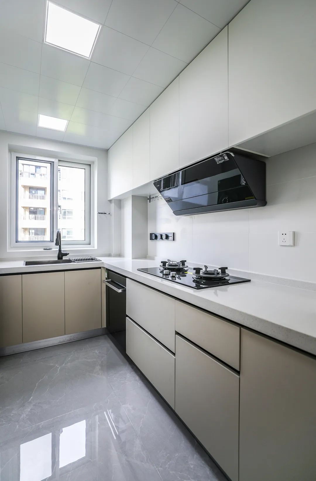 該套房子廚房空間很大,L型兩面櫥柜,另外冰箱邊上也有操作臺,顏色簡潔明快,材質要干凈和好打理,白色的吊頂和米色的櫥柜相呼應,石英石臺面經久耐用,各種廚房電器全部配齊,滿足主人制作各種美食的需求。