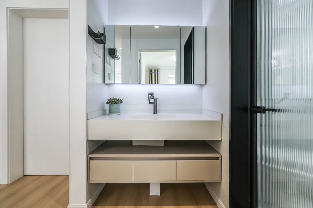 衛生間干區1米長的洗手臺,搭配鏡柜,白色吊頂,黑色鈦合開門,體現主人高檔次的生活品味和優雅的審美觀。