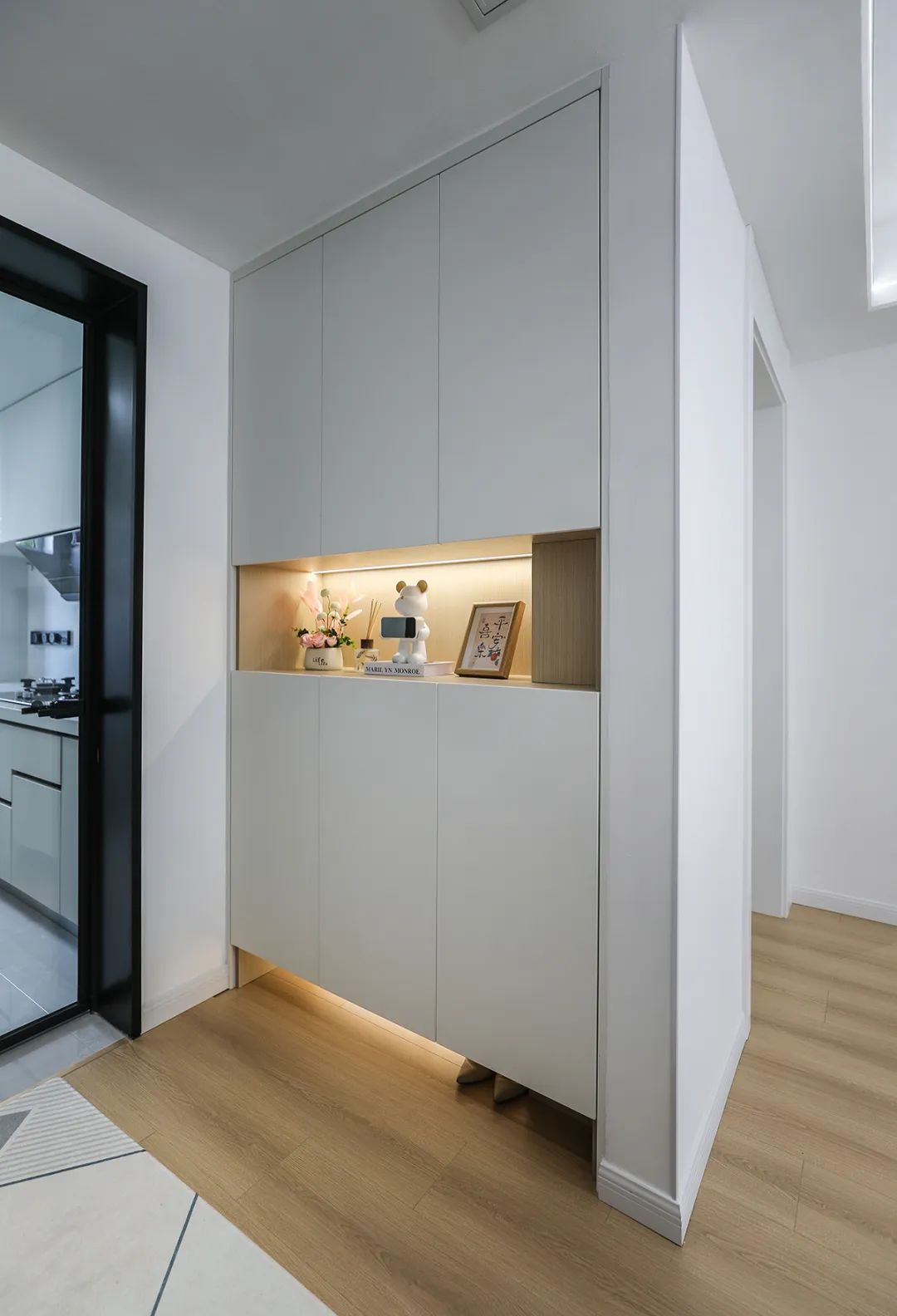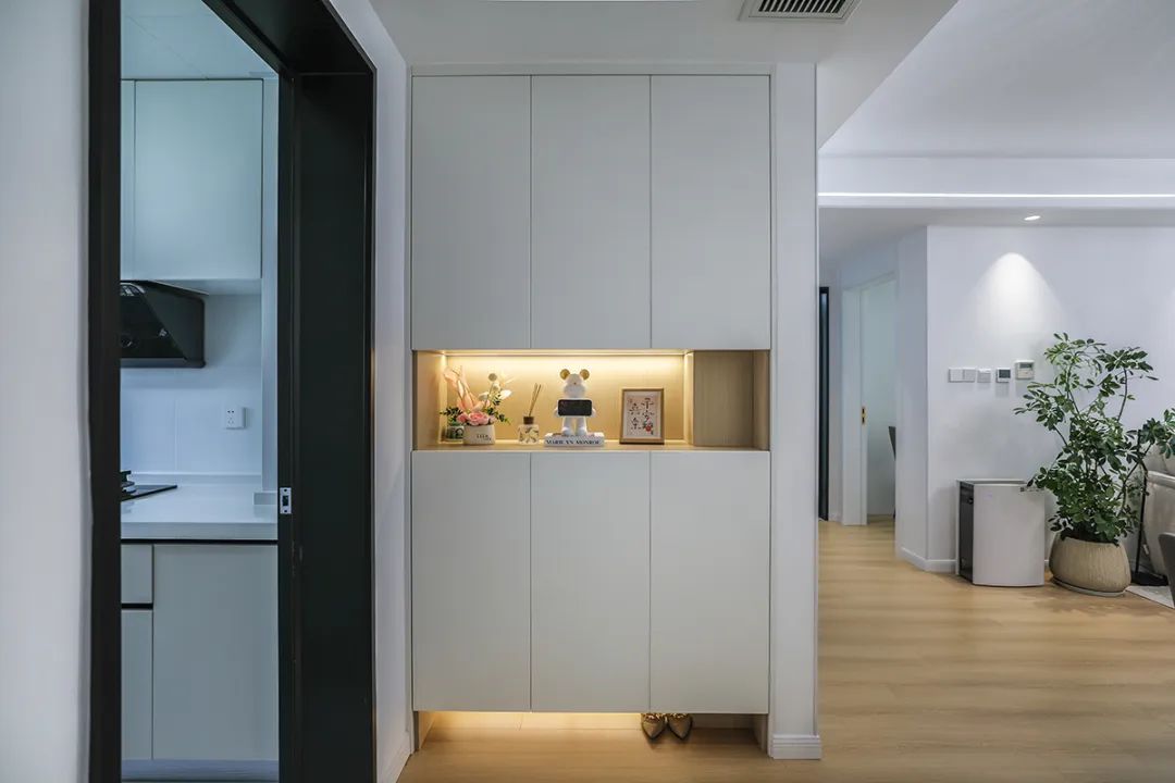 本套房子的入戶玄關柜設計也是一大亮點,既實用,又有裝飾性,三門儲物柜,中間鏤空可以擺點裝飾品,給人感覺不僅雅致而且有韻味。