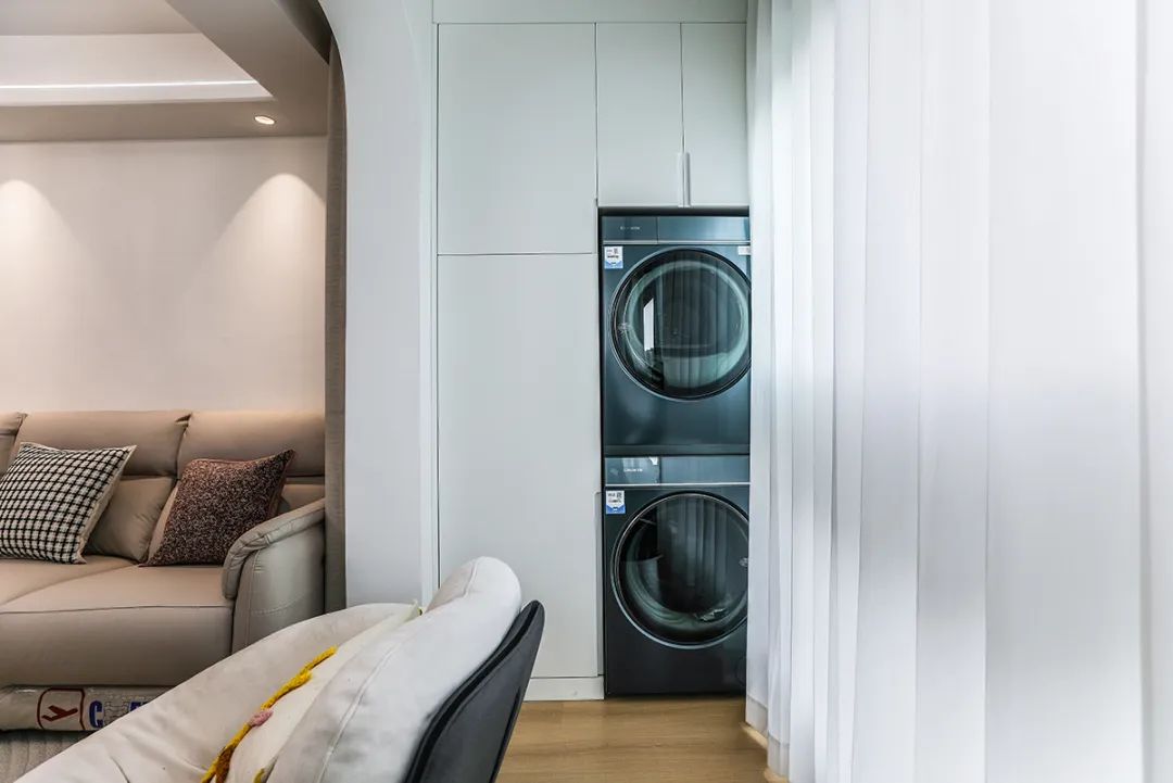 陽臺是晾曬衣物的場所,洗衣機和烘干機疊放,一側為儲物柜,顏色以白色為主,超大玻璃窗讓陽光柔和的照進來,很舒適、很愜意。