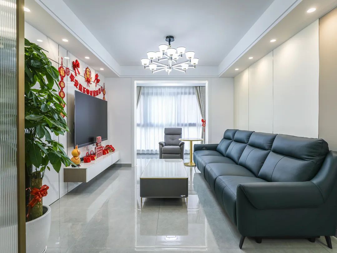 這個客廳擁有寬敞的空間,電視墻整體使用石紋竹木纖維板,灰白色調的石紋和極窄線條,明暗有神,給人一種高貴而神秘的感覺。藏青色皮質沙發擺放在其中,瞬間提升了整個客廳的檔次,而一組按摩沙發的加入,更為客廳增添了一份舒適與愜意。