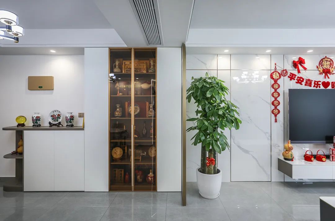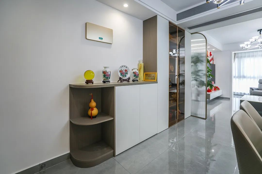 入戶玄關柜從外邊的圓弧形角矮柜到里邊的頂天立地四扇高柜,中間的玻璃門,都體現了主人生意人的處事圓潤、做人挺直腰桿心胸坦蕩的品格。屏風采用金色弧形設計,與矮柜的圓形角相呼應,給人一種不僅雅致而且有韻味的感覺。