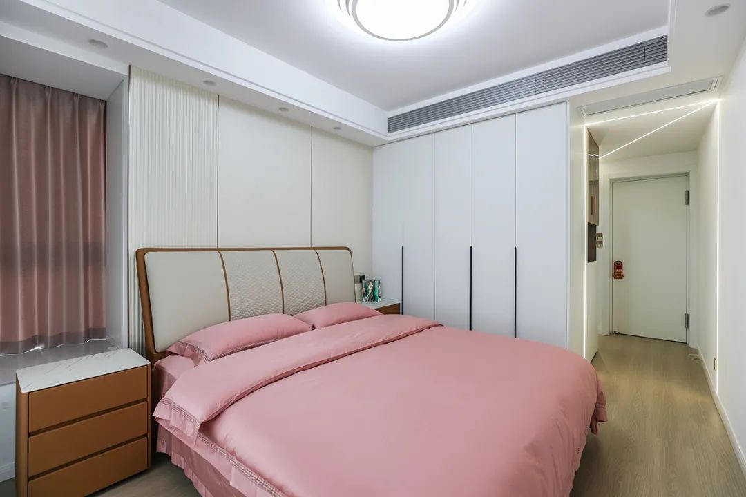 主臥的設計充滿了柔和、溫暖的氣息。奶白色的床頭背景與米色皮質靠背相得益彰,非常和諧。衣柜門板也選擇了白色,與墻面自然融合,宛如一體。而上方通體的空調風口和過道線性燈的設計,增添了空間的層次感,避免了單調。