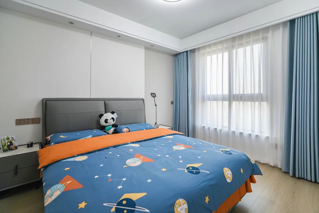 兒童房1.8米灰色皮包床保證小朋友睡覺時有充足翻身空間,睡的安全。衣柜區域正對進門區做一排玻璃門,里面可以放小朋友的玩具和書本。床頭背景墻米白色結合淺灰色竹木纖維墻板,既讓奶白色柜門和墻面、頂面渾然一體,同時呼應了灰色床、床頭柜。