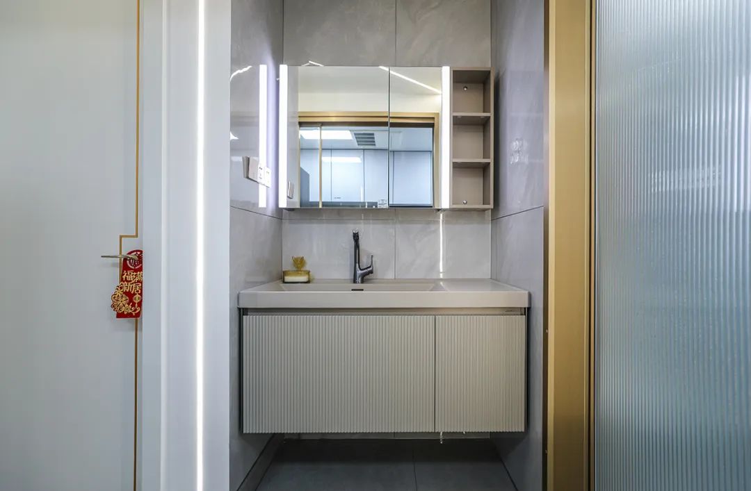 這個客衛通過精心設計和布陳充滿了高檔次的美感。1.2米長的洗手臺、智能馬桶,墻地一體磚以及白色吊頂的搭配,無一不體現出主人優雅、獨特的生活品味。