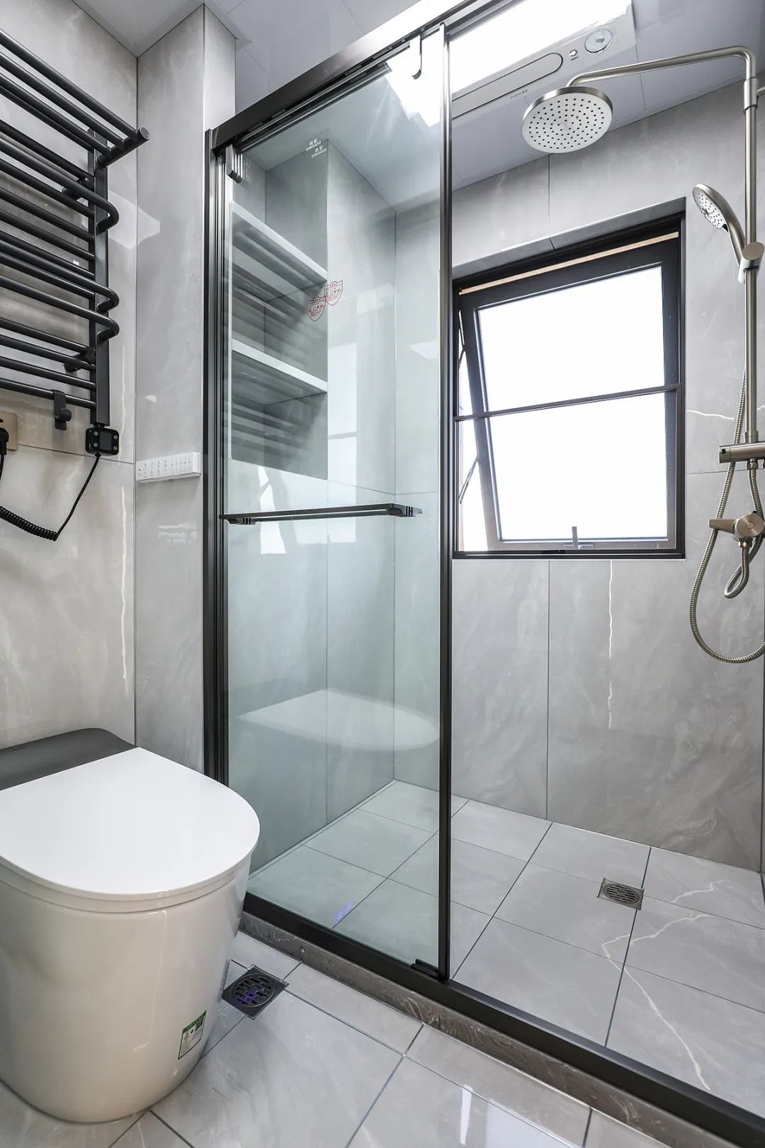 主衛空間寬敞,只放置了一個馬桶和一個洗手臺,沒有單獨的淋浴區域,這樣可以讓空間看起來更加寬敞。灰色的窗戶搭配槍灰色的毛巾架和龍頭,讓整個空間看起來諧調統一。