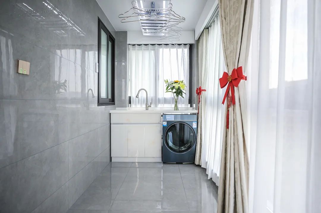陽臺是家居生活中不可或缺的一部分,它不僅是晾曬衣物的場所,更是一個可以享受陽光、感受自然的空間。在這里,一側擺放著洗衣機和水池,方便洗衣和清洗,另一側則是一張按摩椅,可以讓主人在忙碌一天后放松身心。