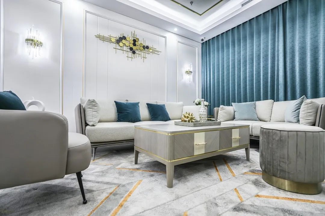 設計說明:該設計采用現代輕奢風格,注重簡潔、精致和高雅的氛圍。窗簾采用了質感細膩,觸感柔軟的布料制作,強調了家具的實用性和舒適性。沙發組合外包材質采用了灰色和米色的布料制作,顏色與窗簾的色調相呼應。同時,空間采用的布料極具透氣性和舒適性,可為業主一家提供了一個舒適的居住環境。