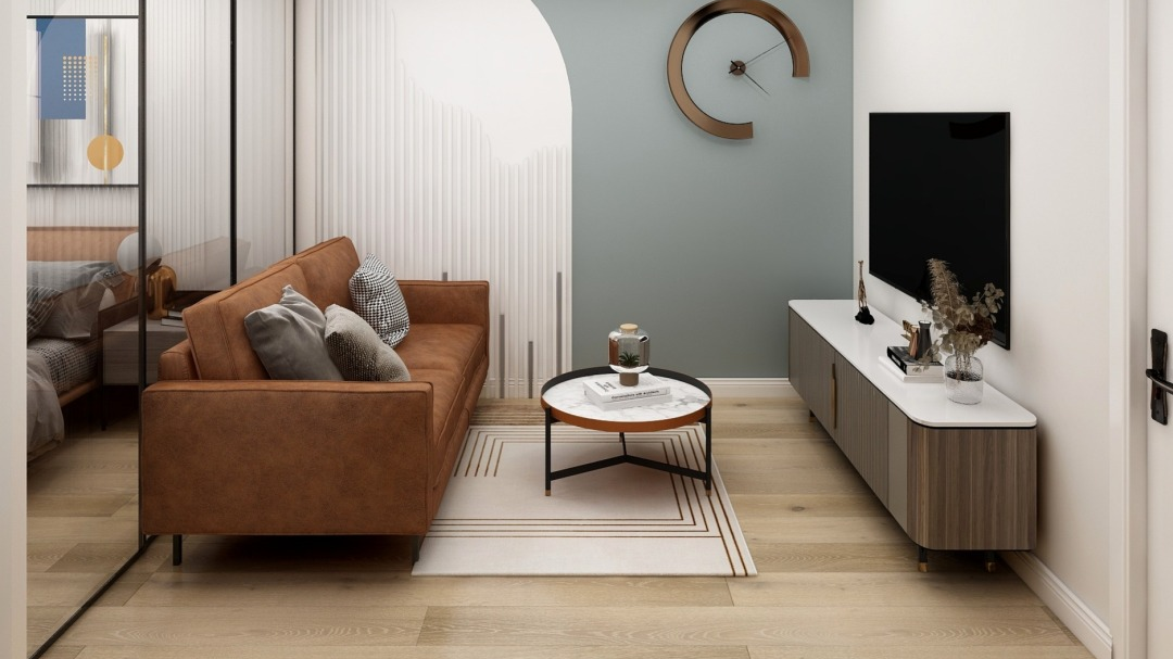 設計說明:該這幾案例采用灰色巖板臺面與木質柜體相融合,營造出現(xiàn)代簡約風格的客廳氛圍。巖板臺面上可以放置音響、花瓶等裝飾品,同時電視墻側面設計了多個抽屜和柜子,增加了儲物空間。整個設計注重自然元素和舒適感,給人一種輕松愉悅的感覺。