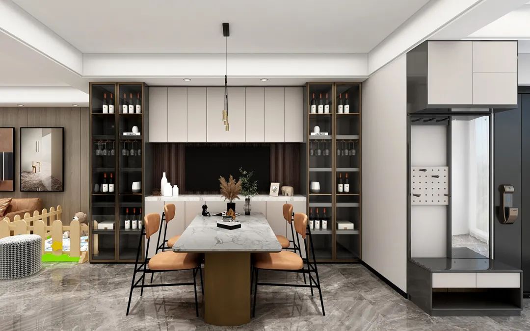 設(shè)計(jì)說(shuō)明:本設(shè)計(jì)案例設(shè)計(jì)師充分利用了空間,將餐廳設(shè)置在樓梯下方,不僅增加了空間的使用效率,還讓餐廳具有了獨(dú)特的氛圍。設(shè)計(jì)師還將唯一整墻設(shè)置了一面墻的儲(chǔ)物柜,既方便了餐具和雜物的收納,又增加了空間的層次感。同時(shí),儲(chǔ)物柜中間還設(shè)置了一排開(kāi)放式的隔層,可以擺放一些裝飾品或書(shū)籍,為餐廳增添一份文化氣息。