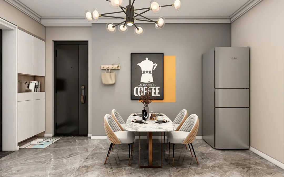 設(shè)計(jì)說(shuō)明:這個(gè)餐廳案例采用角落式餐廳,利用入戶進(jìn)門(mén)角落空間設(shè)計(jì)餐廳。為了更加美觀,我們?cè)谶x擇餐桌椅時(shí)選擇細(xì)腿的樣式,視覺(jué)上更靈巧。同時(shí),在墻上掛幾幅設(shè)計(jì)感十足的裝飾畫(huà),以減少視覺(jué)上的單一感。