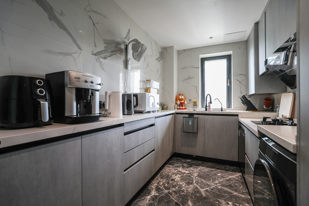設計說明:以簡約線條和現代材質為主,打造出簡潔而不失設計感的廚房空間。大面積的淺色圖案瓷磚墻面與深色大理石地板形成對比,具有很好的視覺效果。內置的電器設備和儲物空間使廚房更加整潔有序。