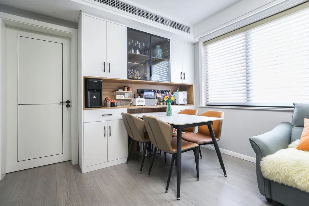 靜安區曲沃路:該套房子面積還可以,但由于戶型問題導致客廳區域比較小,所以采用一體化客餐廳設計,然后根據采光和格局設置為角落餐廳,值得一提的是我們根據餐桌特意定制了配套的餐邊柜,更美觀也更方便。餐邊柜整體原木色搭配奶白色門板,依然主打簡約,搭配巖板的餐桌,皮質的座椅,多用材質碰撞,簡約大氣又不失清新明朗。