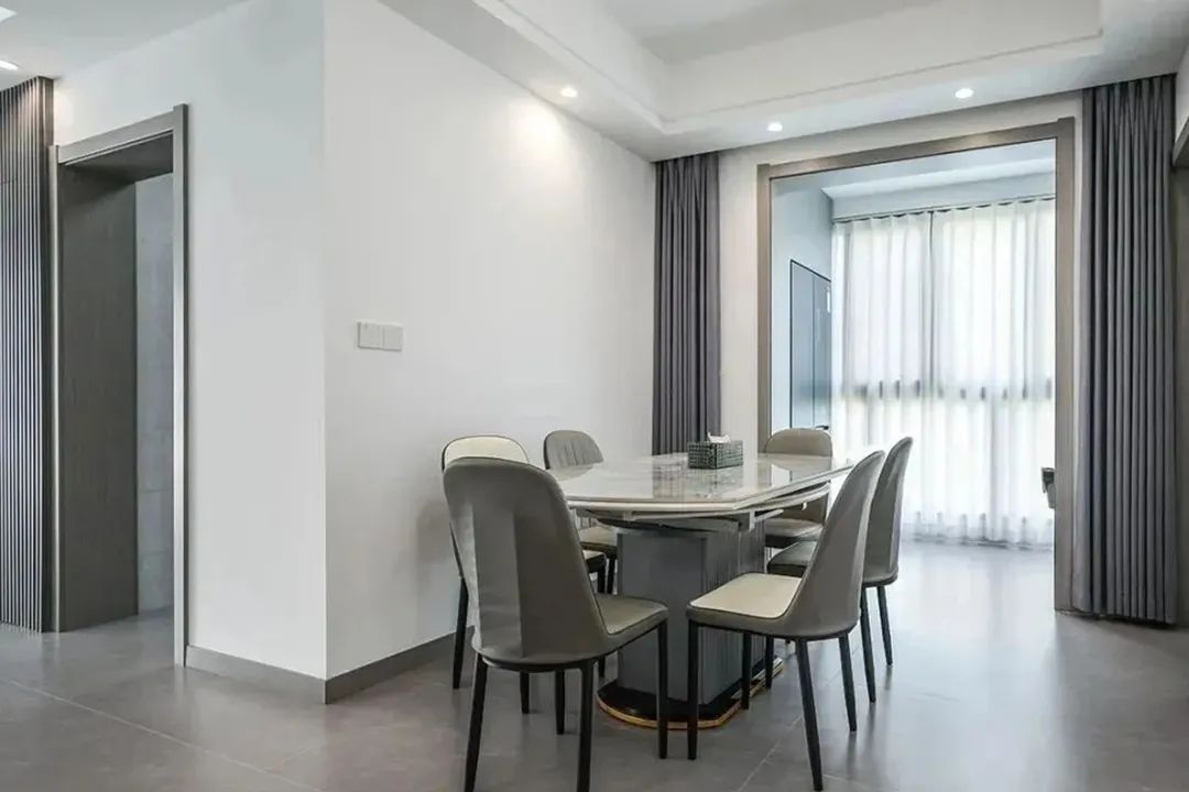 長臨路1118弄:該業主喜歡簡單,于是我們在現代簡約的風格基礎上,用設計和新創意來創造個性,設計家具以新材料,新技術,強調功能性與簡約線條美。創意上盡可能將餐廳的空間最大化,在充分考慮到不影響視覺效果的前提下,放大了餐廳的尺寸,并且安排了轉角餐邊柜,收納直接翻倍。