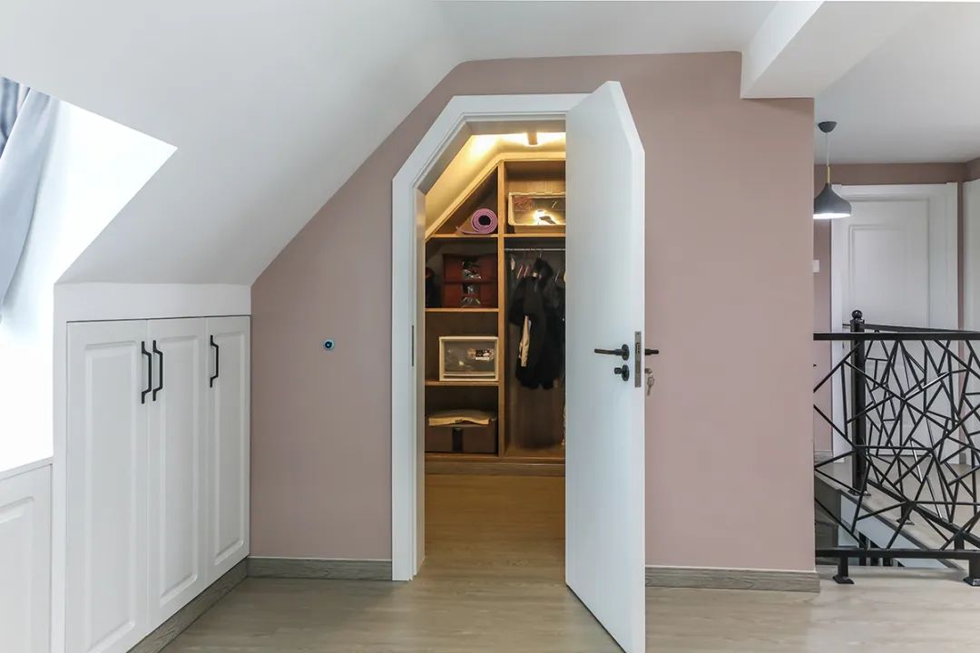 這種設計可以避免開放式衣服架積塵的問題。高矮搭配的儲物柜非常實用,但要注意高柜不要過多,以免使整體空間顯得壓抑。