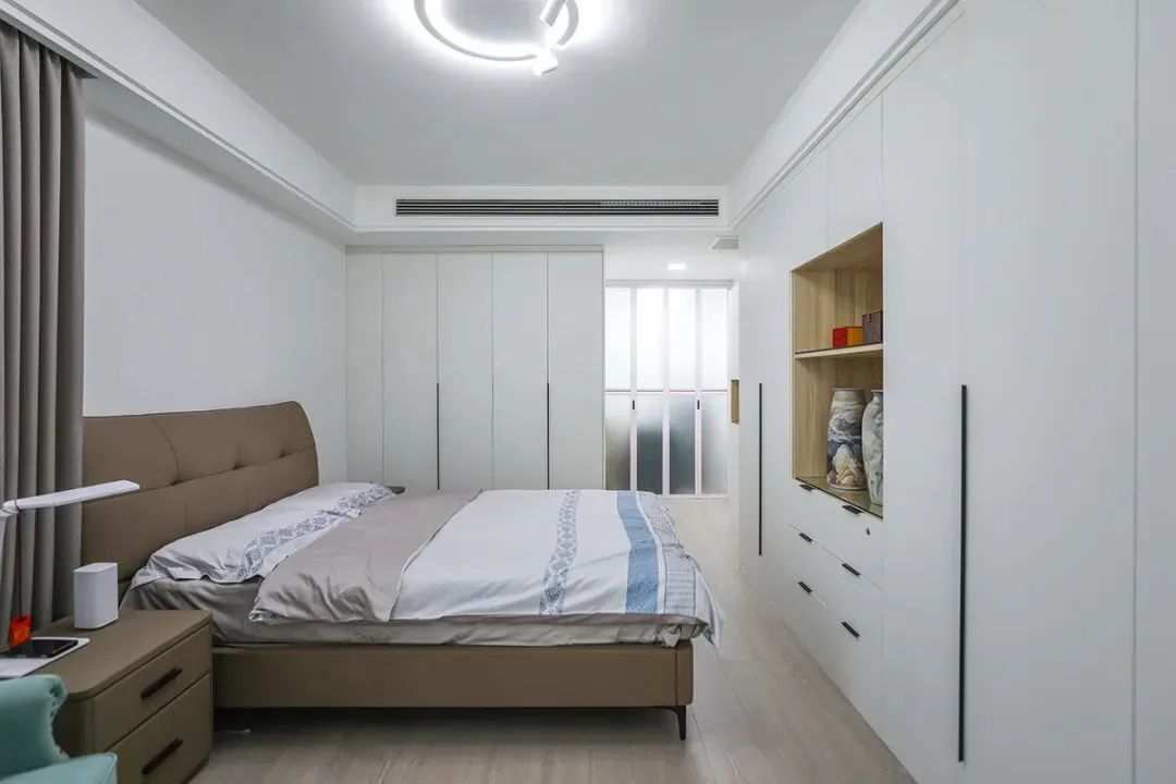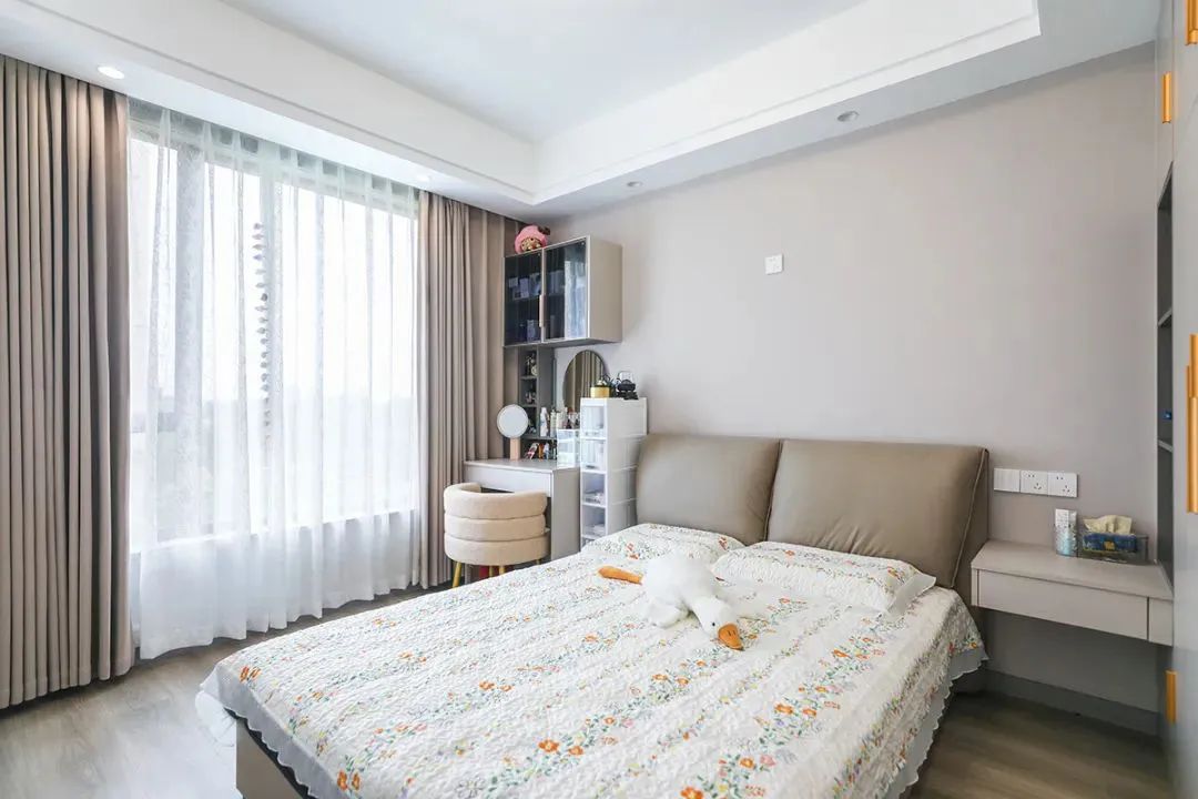 鎮(zhèn)坪路176弄:該套房主臥地面鋪以暖灰色地板,衣柜與墻面色彩統(tǒng)一,相得益彰。四周雙眼皮吊頂加上中間拉平無主燈的設(shè)計(jì),讓空間顯得尤為寬敞。根據(jù)業(yè)主需求我們?cè)谟邢薜目臻g里做了衛(wèi)生間,實(shí)現(xiàn)“帶衛(wèi)生間主臥”的夢(mèng)想。床尾還特地定制了電視柜,這間臥室的各種設(shè)計(jì)細(xì)節(jié)基本能滿足業(yè)主的所有居住需求。