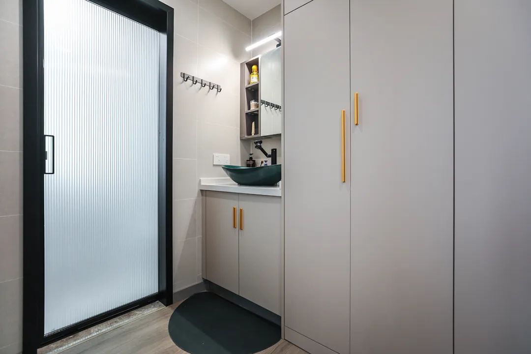 ↑↑接上,而且由于這個(gè)主臥空間比較大,我們根據(jù)業(yè)主精致的生活方式,將臥室分割出一個(gè)帶洗手池的衣帽間,衣帽間采用雙面通頂柜,滿足業(yè)主海量衣物收納,洗手池設(shè)計(jì)也讓業(yè)主起床洗漱更加便捷。