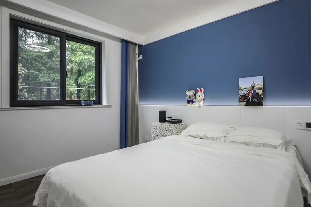 巨峰路997弄:這套房根據(jù)業(yè)主的喜好采用的是奶油風(fēng)裝修風(fēng)格,而且業(yè)主對(duì)海洋、對(duì)海洋藍(lán)色情有獨(dú)鐘,由于海藍(lán)色和奶油白色對(duì)比度比較大,一般很少采用將這兩種顏色作為大面積色使用,為了滿足客戶的喜好和要求我們將床頭背景用海藍(lán)色、其它三面墻用白色,背景藍(lán)色做了簡(jiǎn)單的燈光處理,將藍(lán)色漸變化,消解一些藍(lán)色,讓藍(lán)色融入整個(gè)奶油風(fēng)格中。窗簾也采用了海藍(lán)色窗簾,這樣可以通過光的折射讓奶油白墻上也多了一些藍(lán)色的靈動(dòng),兩種顏色很好的溶解在一起,更顯和諧。