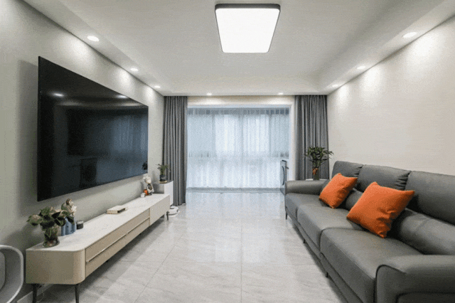 這套翻新裝修案例采用了極簡風格的設計理念,強調“少即是多”的裝修哲學。在客廳中,我們看到整個空間選用白色和灰色為主調,沒有任何多余的裝飾。一張簡單的深灰皮質沙發搭配上一張簡約電視柜,再加上綠植作為點綴,整個空間顯得十分簡潔而舒適,讓人們在喧囂的城市中找回了寧靜和舒適的感覺。