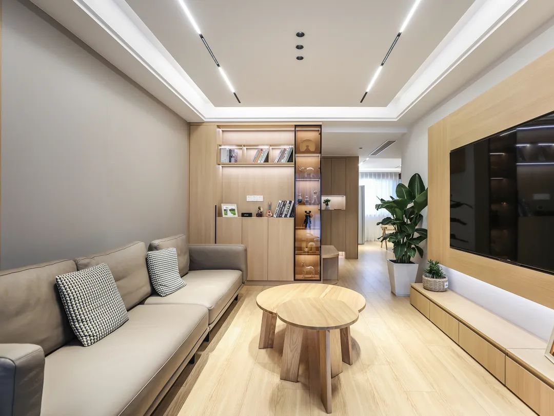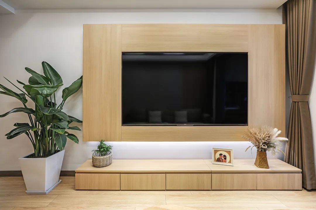 定制柜下面做了五個抽屜落地,滿足收納的同時還有臺面可隨心擺放心儀物件,營造專屬溫馨氛圍。這樣簡單的電視墻設計不僅滿足業主的預算要求,也能讓原風木舒適得體不過分。