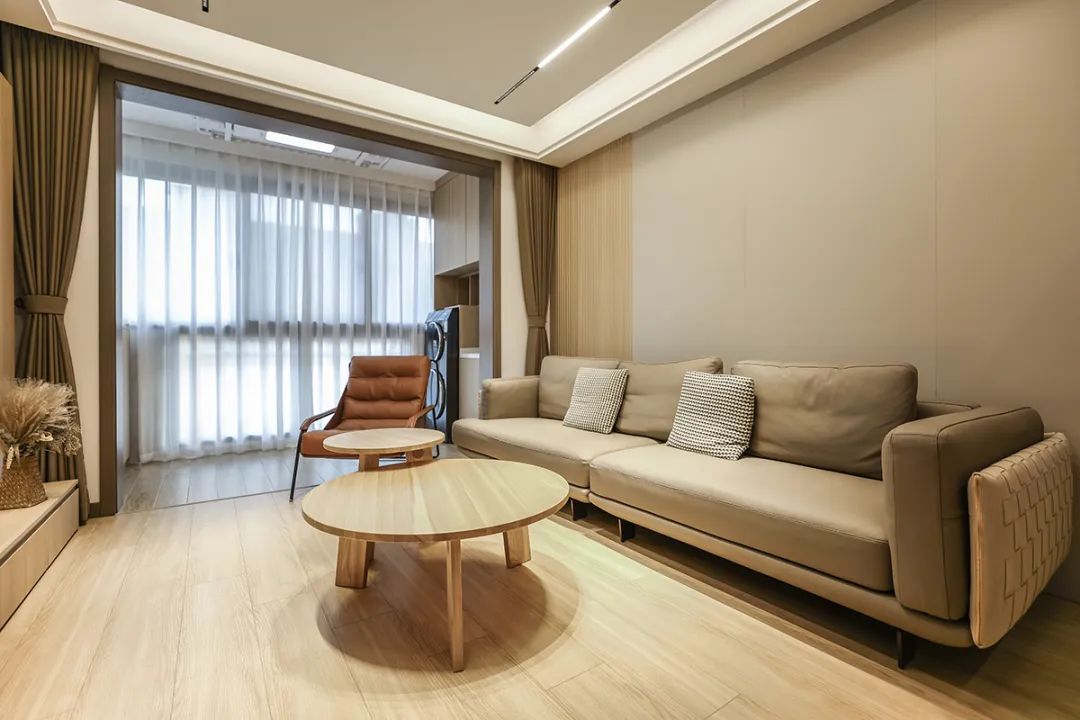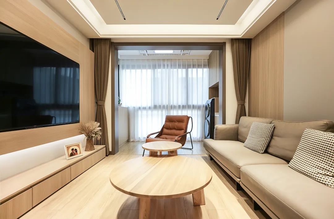 客廳是體現裝修風格的關鍵空間,所以我們和女主人一起在客廳規劃上花了很大的精力。由于客廳為超長戶型,我們就用組合柜、幕簾分割出獨立玄關、方形客廳、寬敞陽臺三個空間,每個空間既獨立又統一,可隨心盡享。