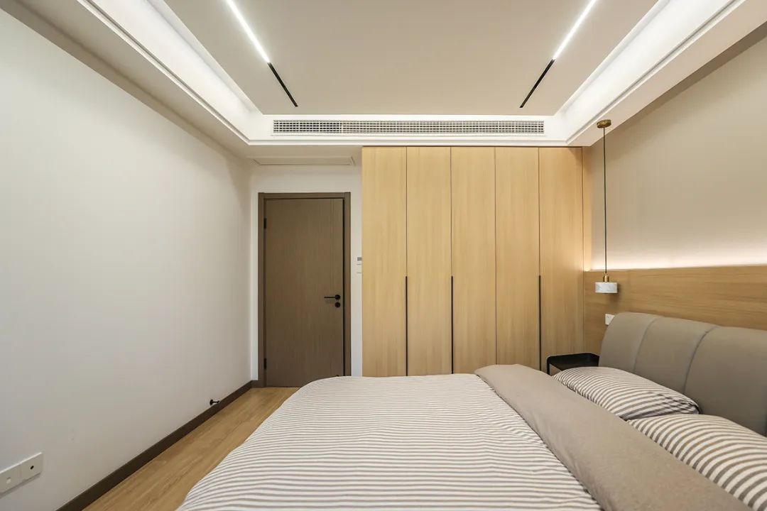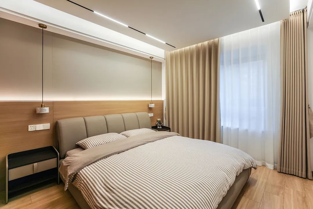 主臥地面鋪的實木復合地板,房頂采用懸浮無主燈+線性燈。背景墻選了現在比較流行的硬包+原木色墻板。柔和的色調,半墻造型點綴燈帶線,讓家里氛圍感更純粹。皮革硬包+原木色木飾面+燈帶,見光不見燈,配上咖啡色的窗簾和白沙,整個空間層次明細,原木風效果突出。
