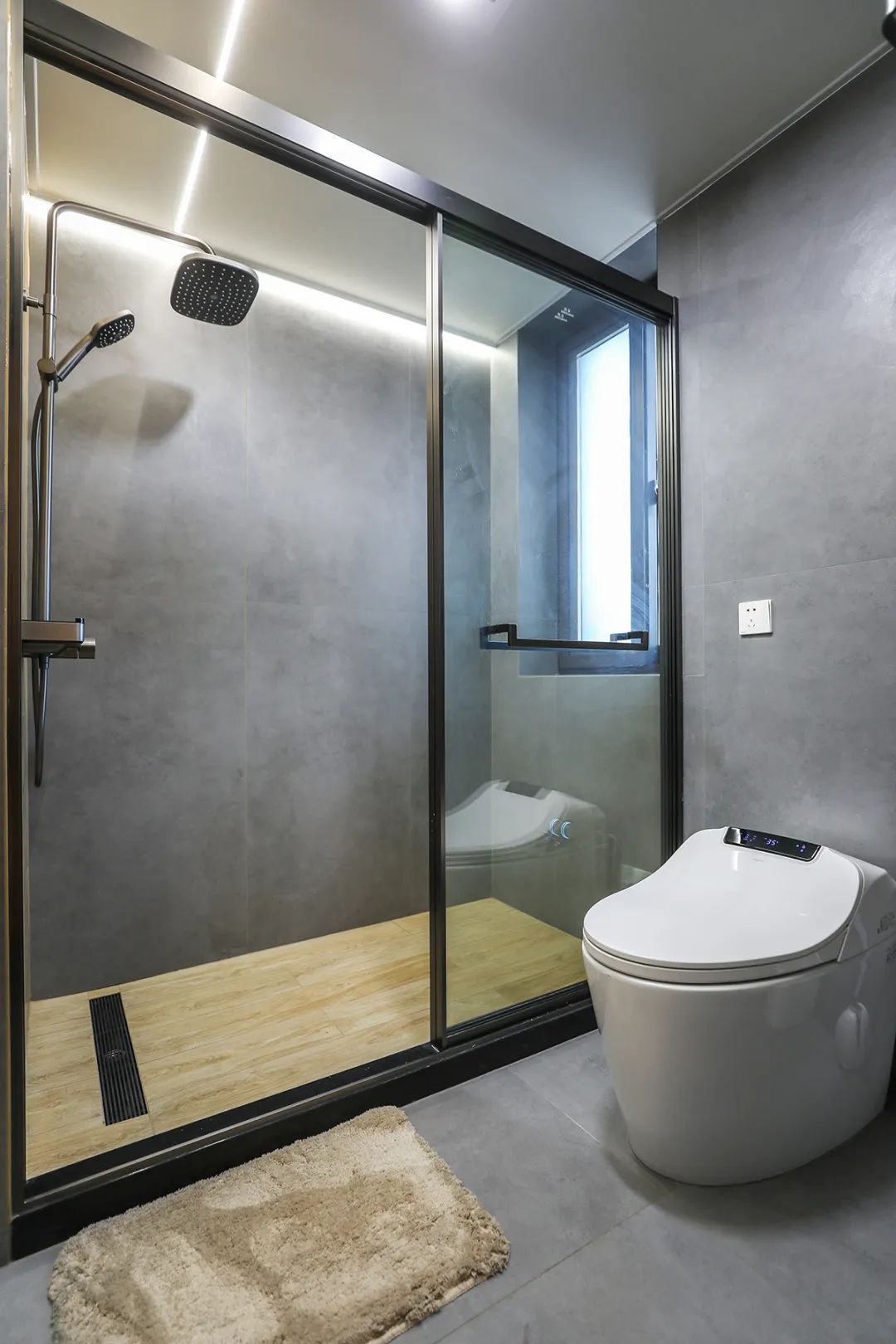 衛生間地面鋪600*1200的啞光灰色地磚,直接拿地面磚上墻。節省花費也使得衛生間個性另類。衛生間濕區采用木紋磚、槍灰色地漏,頂面采用現在流行的蜂窩大板,再配上線性燈和筒燈,讓整個衛生間光源充足更上檔次。