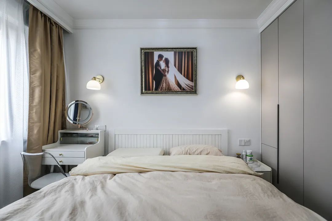 主臥相對簡單實用,頂面石膏線走邊,墻面淺色涂料。1.8床左邊床頭柜右邊梳妝臺,衣柜靠近床頭柜單獨(dú)設(shè)計門板。墻中用裝飾畫點(diǎn)綴,整體空間更顯自然協(xié)調(diào)。
