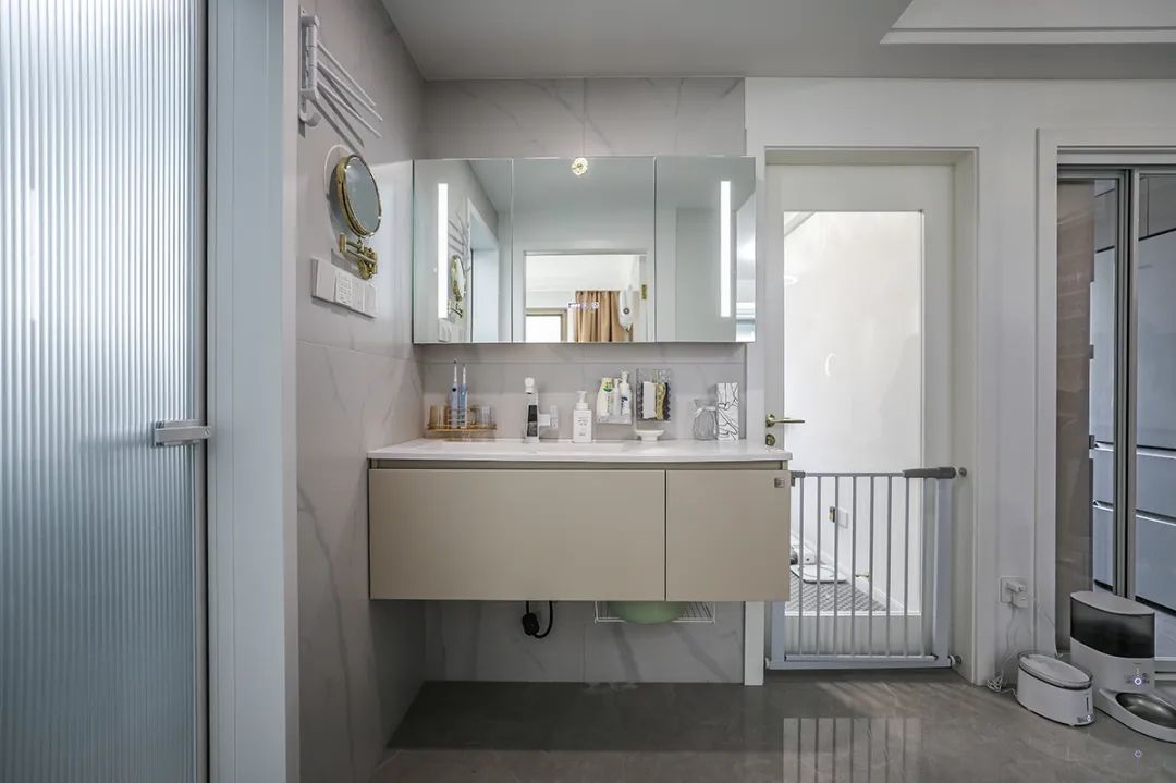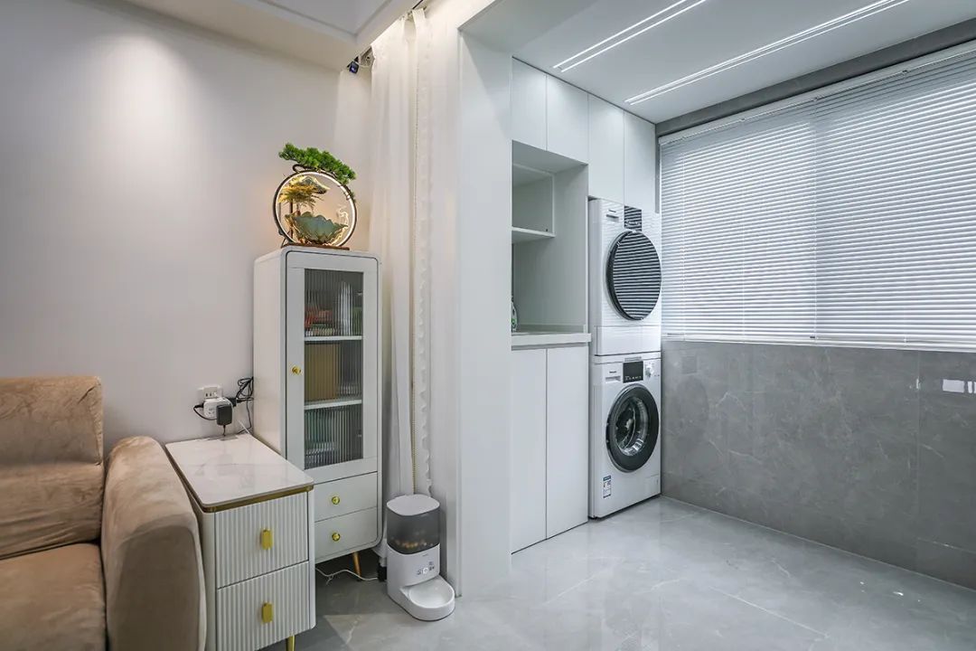 陽臺一邊做洗衣區(qū),烘干機(jī)+洗衣機(jī)整體疊放更省空間。左邊增加臺盆,用于清洗小物件。而另一邊我們?yōu)闃I(yè)主的兩只狗狗做了寵物區(qū),將寵物的臥房嵌入其內(nèi),更顯整體美觀。寵物上方作了懸空柜,可放置狗糧、寵物用品。整個陽臺區(qū)我們也合理的利用每一寸空間,沒有浪費(fèi)任何角落。