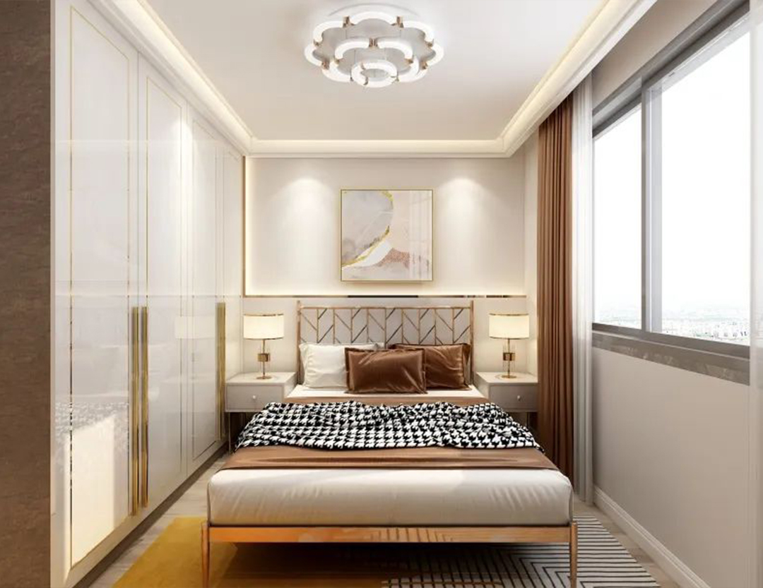 設(shè)計說明:這個臥室以暖色為主,搭配了一些藝術(shù)裝飾元素。墻壁采用了米灰色,搭配暖黃色的床和裝飾畫,營造出一種溫馨而舒適的氛圍。在燈具方面,使用了金色流線型藝術(shù)燈,讓整個空間更加豐富而有趣。