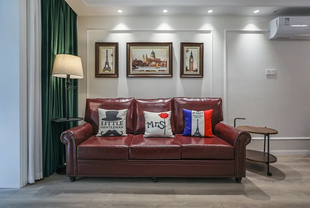 高飽和度的皮質沙發把復古的格調演繹出來,吊燈和落地燈的選擇都共同打造油畫一樣的美感氛圍。暖色調的墻漆和地面瓷磚相呼應,懸掛背景墻上的裝飾畫更是恰到好處,精心挑選的畫框和位置,提升整體設計效果。美式復古風的濃郁風情在這個客廳的種種細節里,體現的非常充分。