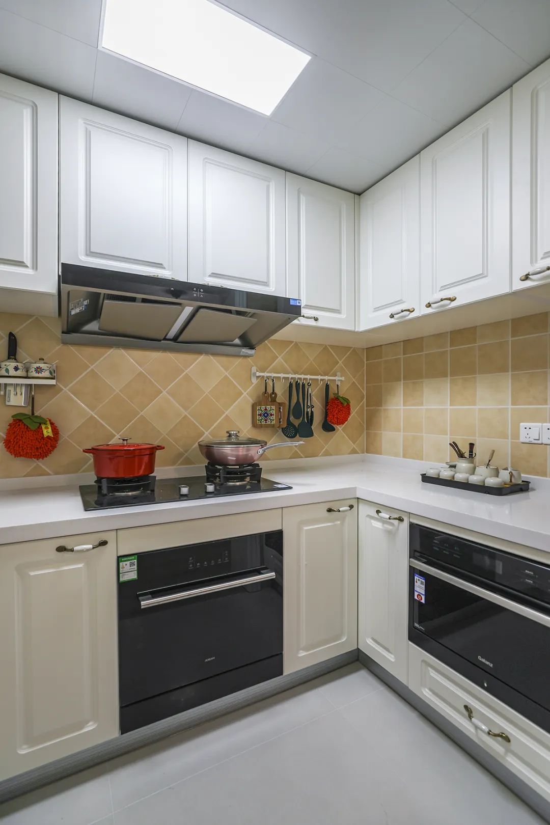 U型櫥柜滿足業主喜歡做飯的需求,棋盤格地磚讓整體不顯單調,?淺的地柜做開放式,可以放一些瓶瓶罐罐。