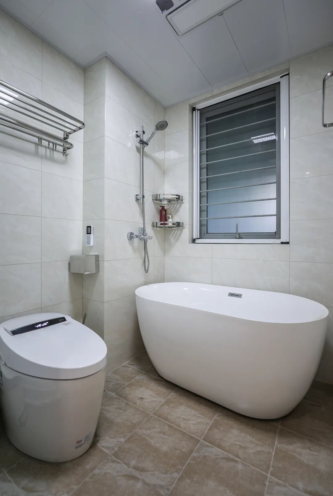 衛生間的瓷磚選擇暖白色瓷磚充分提升空間收納的利用率,貼磚師傅良好的手藝。