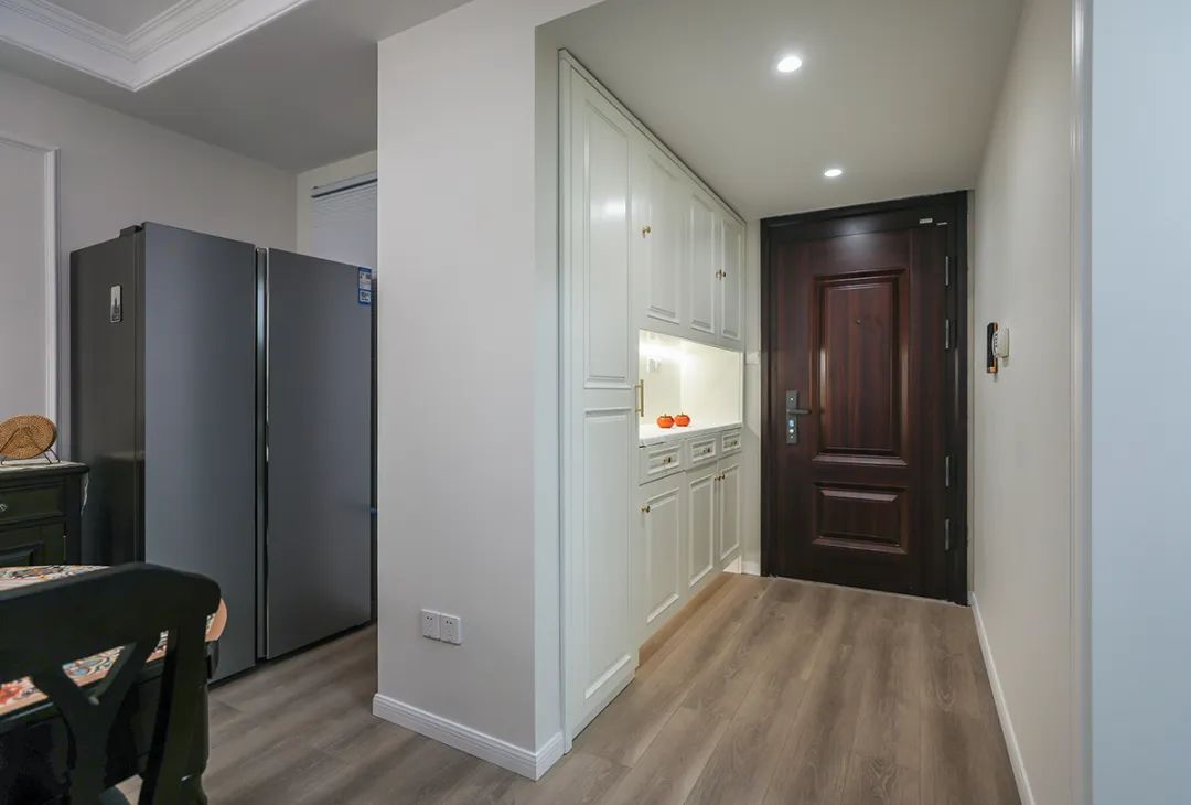 入戶空間僅2㎡左右,且寬度僅1148mm,特意選了這款到頂鞋柜,用來滿足日常換鞋和隨手置物的需求、各種囤貨、雨傘等),鞋柜和儲物柜都做了扣手槽設計讓生活更輕松