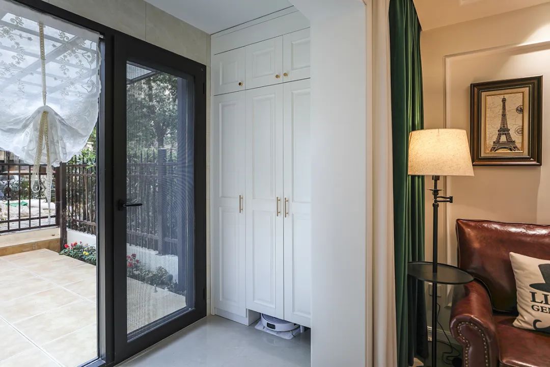 美式實木床鋪實用又舒適,臥室的功能性俱全。通頂的衣柜有著高級的質感,美式風情處處昭顯。