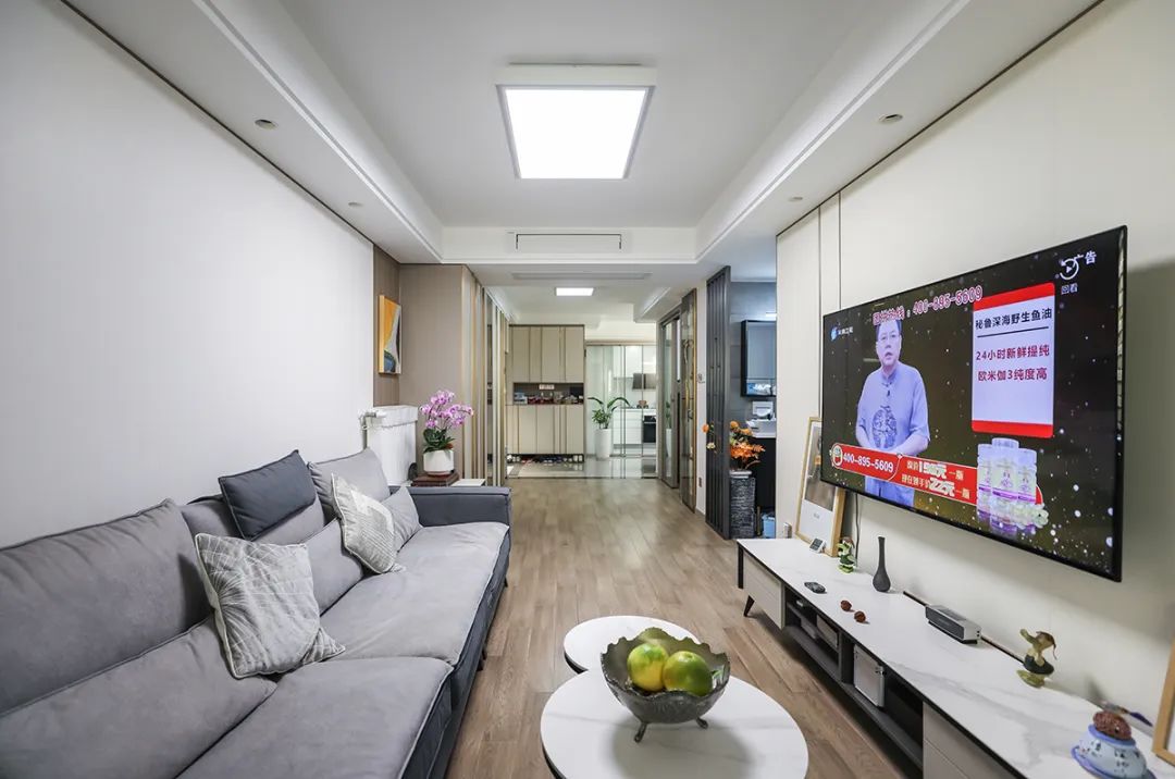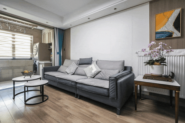 沙發背景墻也采用了色調統一的纖維大板材質,純色與木色的簡單拼接,讓客廳區域增添秩序感。裝飾方面我們用邊幾、花瓶和掛畫點綴空間,讓客廳區域靈動、充滿了生活的氣息。