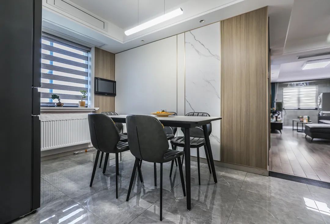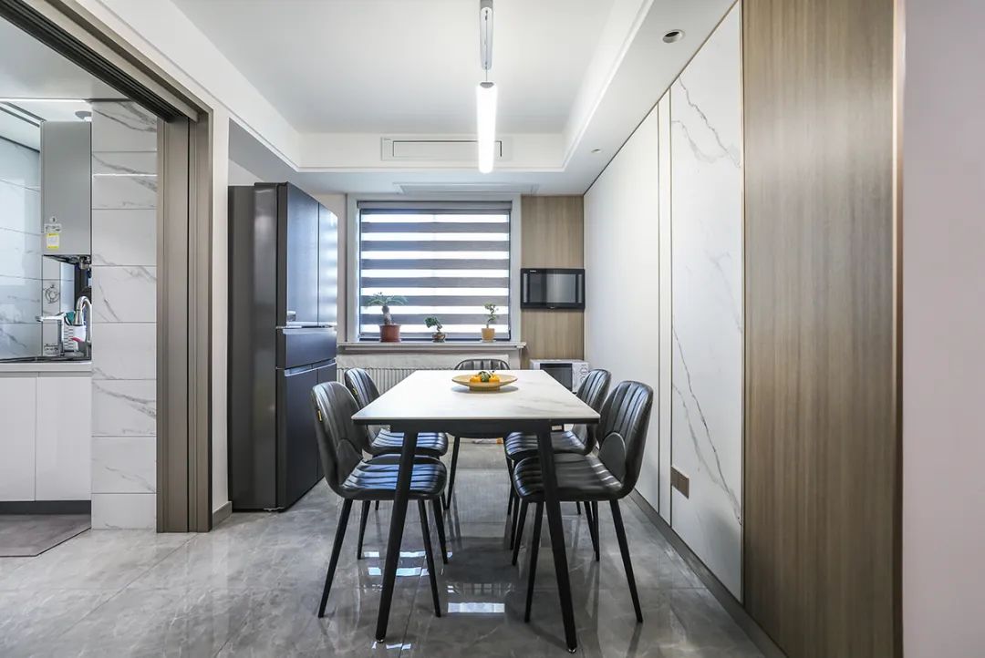 餐廳區域依照我們對生活的理解,從細節著手,打造出實用又充滿溫馨的用餐環境。餐廳地面選用地磚通鋪,餐桌則精心挑選了巖板材質,既方便日常清潔維護。