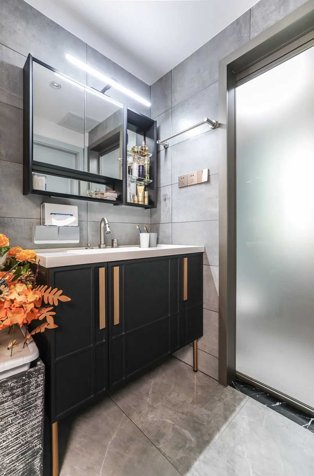 衛生間采用干濕分離設計,既方便日常的洗漱和清潔,又提升了空間的使用效率。特別打造的1.2米超大臺盆柜,不僅提供了充足的儲物空間,還避免了早上多人洗漱的擁擠情況。