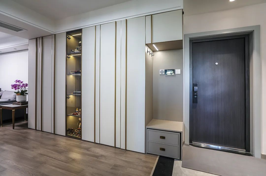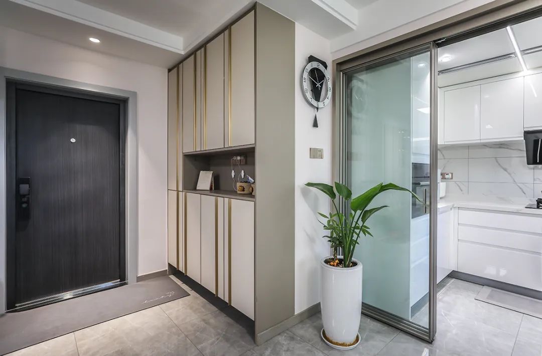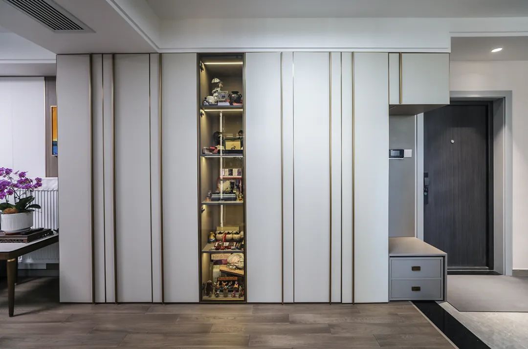 走道儲物柜的設計是一大亮點,門板采用平板一門到頂的設計,金屬通頂拉手更顯大氣。通頂設計不僅具備強大的儲物功能,其簡潔的外觀也為家居生活增添了一份裝飾性。