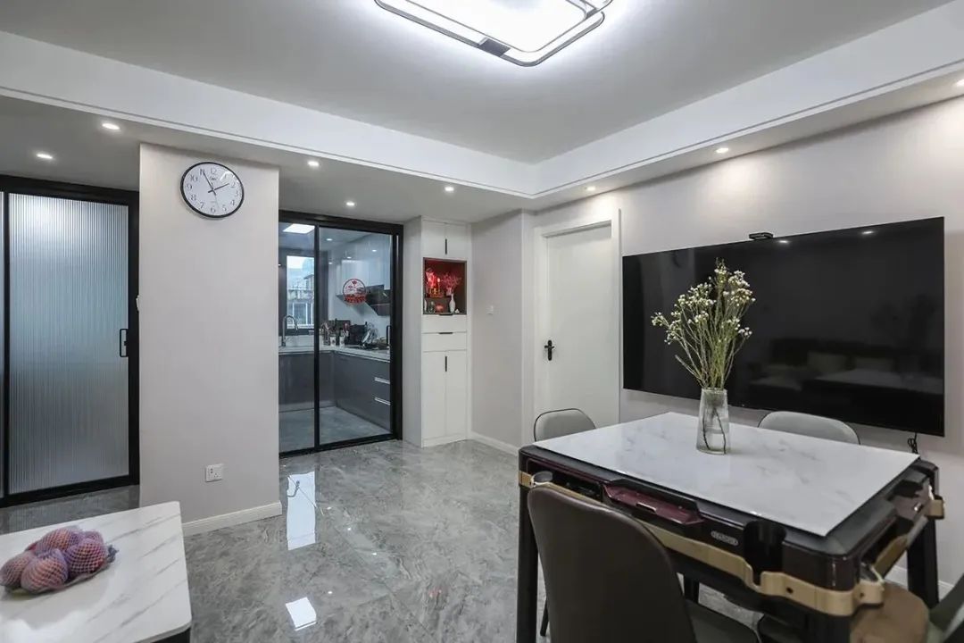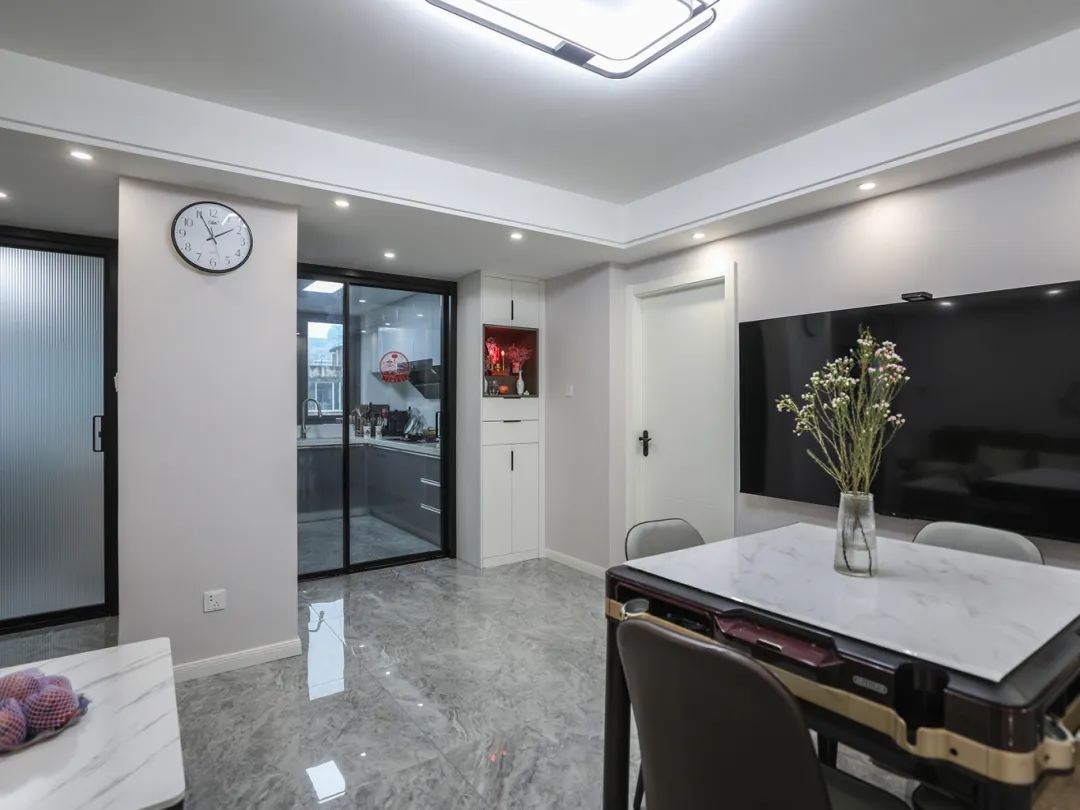 由于空間局限,我們采用角落餐廳設計。根據業主夫婦的打麻將喜好,我們精選了一款帶滾軸的移動麻將桌,日常生活中當作就餐桌使用,娛樂休閑的時候擺放在客廳中央,一邊放著電視一邊打麻將,氛圍感拉滿。