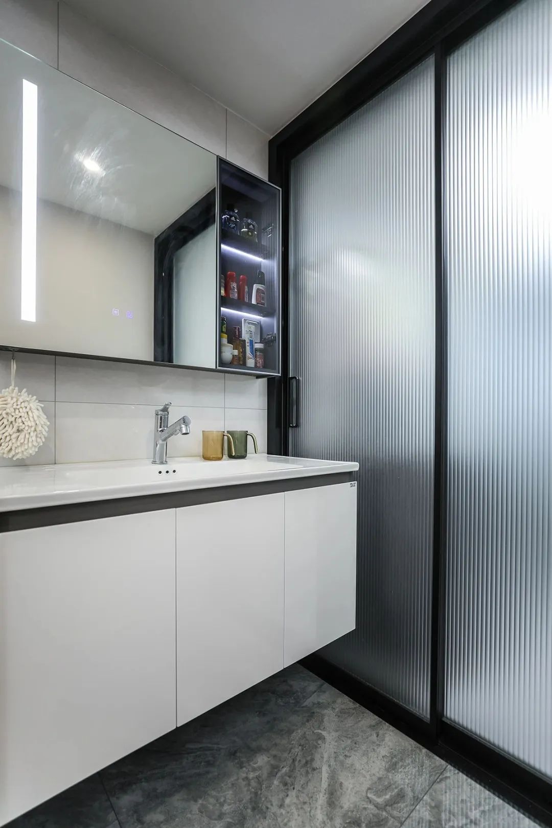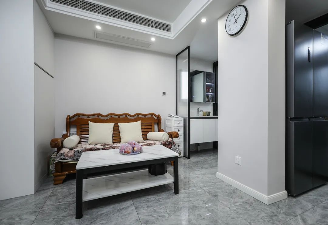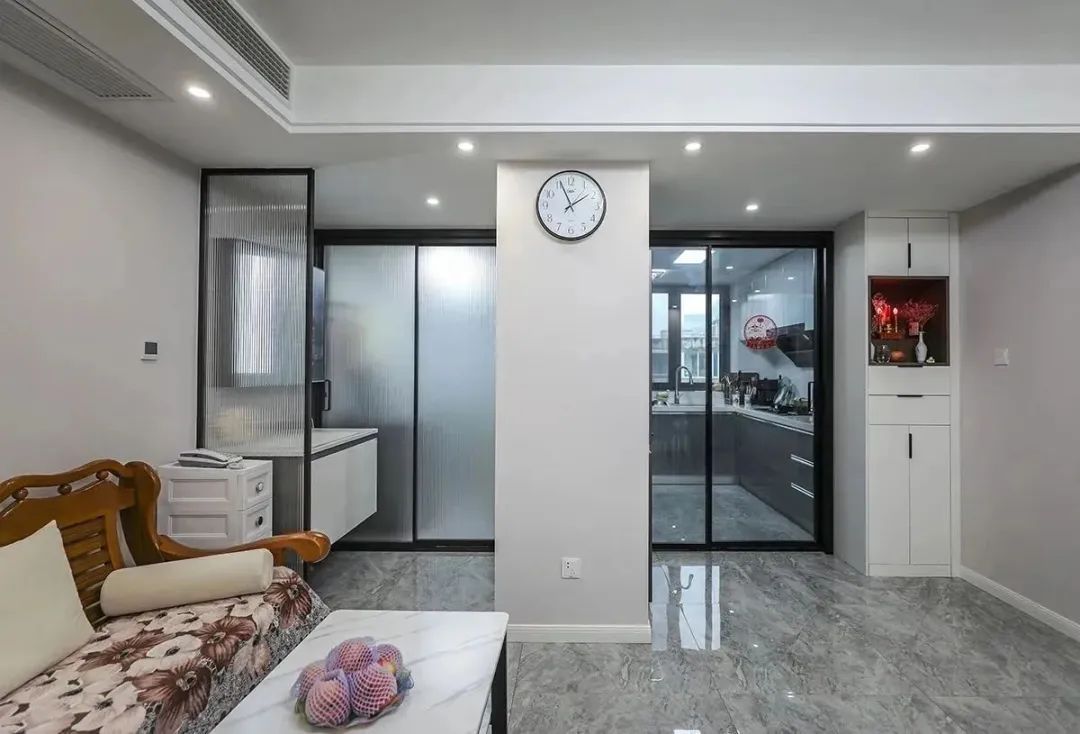 客廳與洗手臺、客廳與廚房均采用玻璃隔斷,更好地利用自然光線,增加空間的通透感,減少空間小帶來的壓抑感,讓整個空間視覺上更加明亮、寬敞。