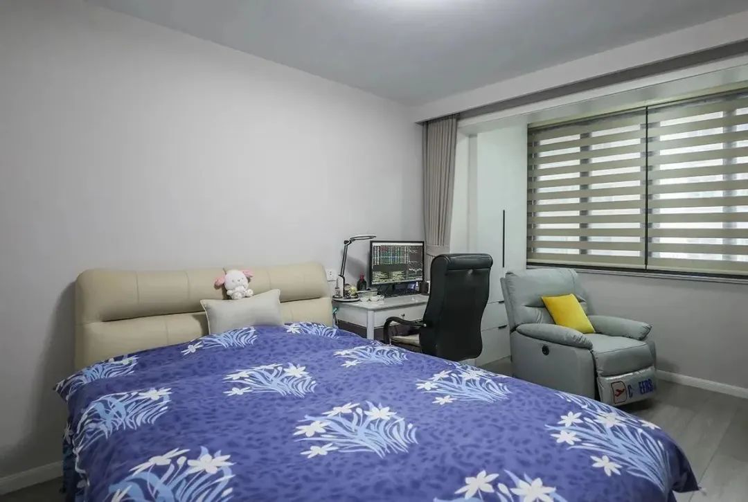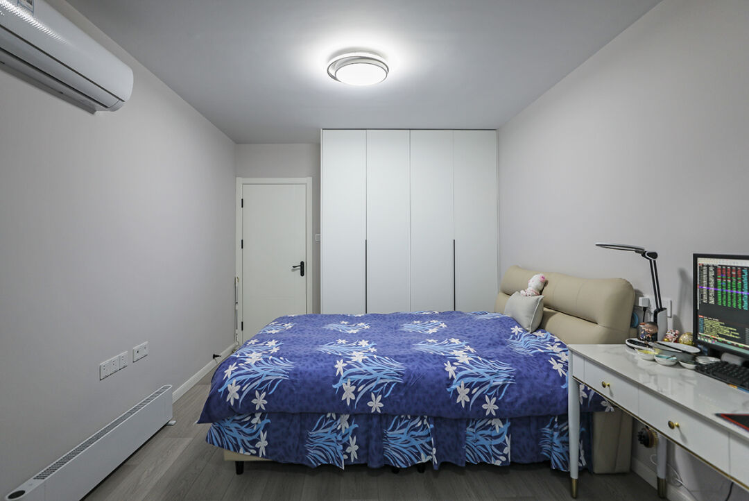 次臥設計整體追求的是溫馨舒適的氛圍,我們選擇了白色墻壁和天然木地板的搭配。在色彩的運用上,我們以白色為主色調,讓整個臥室看起來清新自然。同時,我們非常注重細節的打造,比如床頭燈和裝飾畫等小物件,都經過精挑細選,為臥室增添了幾分溫馨和浪漫的氣息。